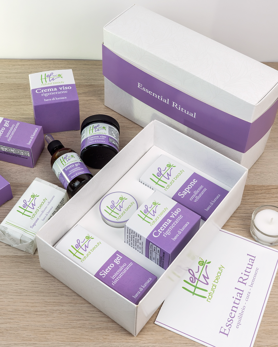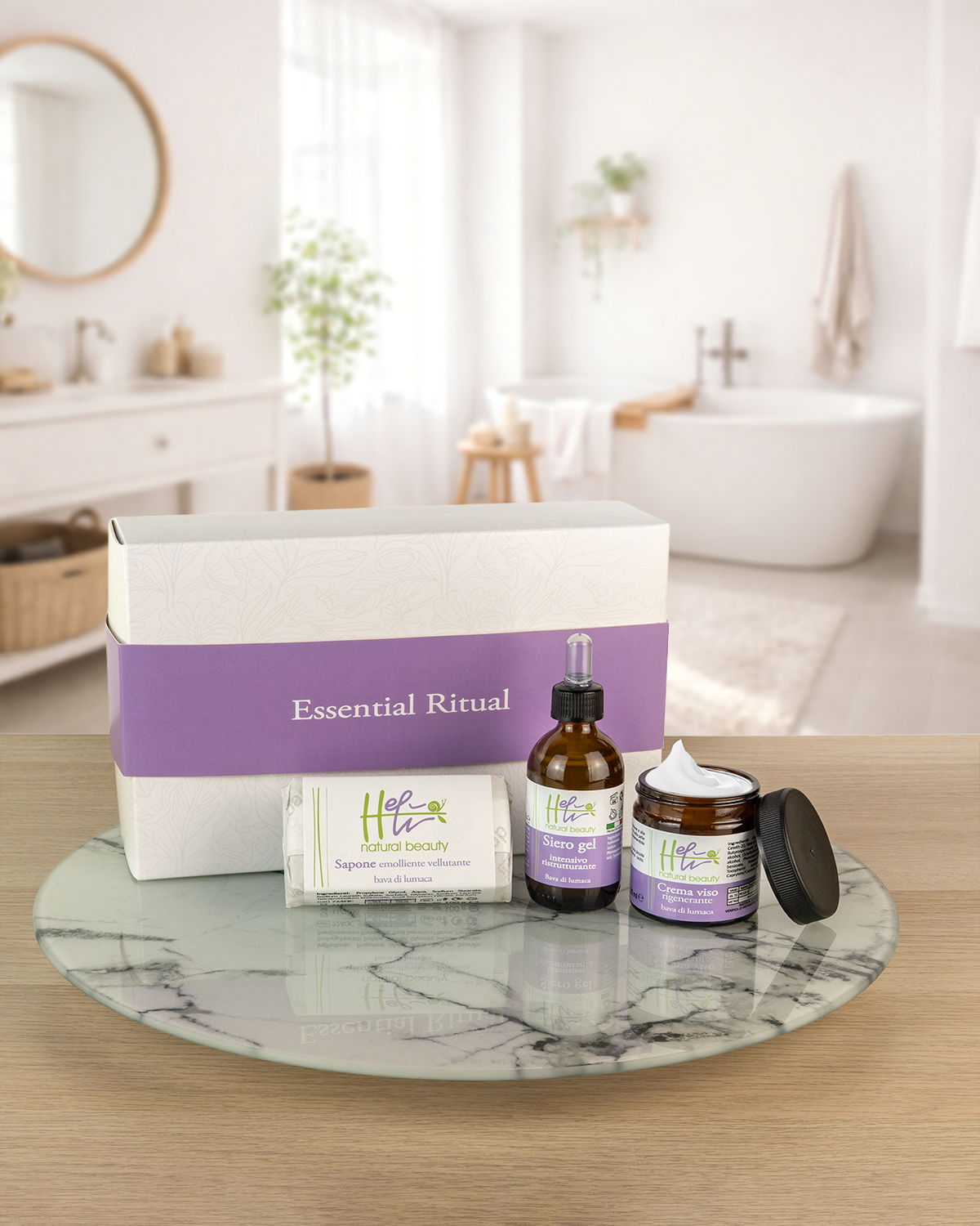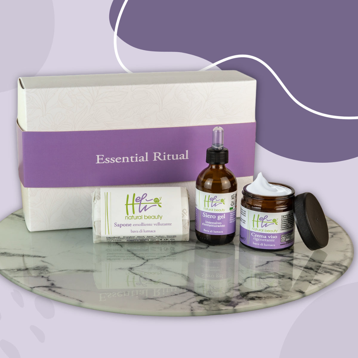 Essential Ritual è un elegante set che racchiude i prodotti più importanti della nostra linea cosmetica Helì natural beauty: sapone, crema viso e siero gel.