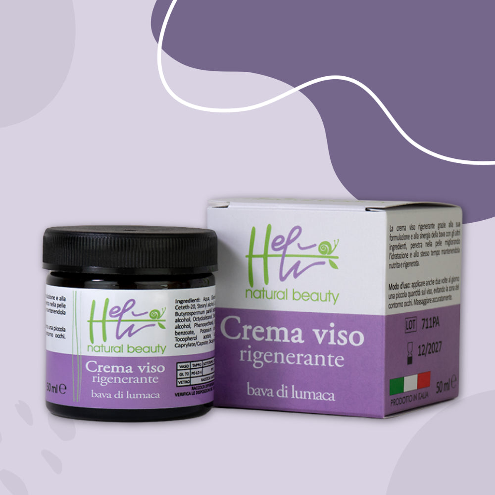 La crema viso rigenerante Helì rappresenta la vera e maggiore evoluzione dei cosmetici a base di bava di lumaca. Progettata tenendo conto degli effetti collaterali che alte percentuali di bava portano con se, questa crema ridefinisce gli standard di assorbimento, penetrabilità ed idratazione per la pelle. Adatta finalmente anche alle pelli più grasse, la crema viso rigenerante è un trattamento giornaliero per il viso che dona freschezza, idratazione, nutrimento, luminosità ed azione anti ossidante contro gli inevitabili segni del tempo, senza lasciare la sensazione di pelle grassa e trasudata.